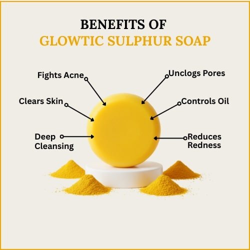 Glowtic Sulphur Soap is widely used as a sulphur soap for acne treatment. Sulphur helps reduce acne-causing bacteria, dries out active pimples, and supports clearer-looking skin over time.